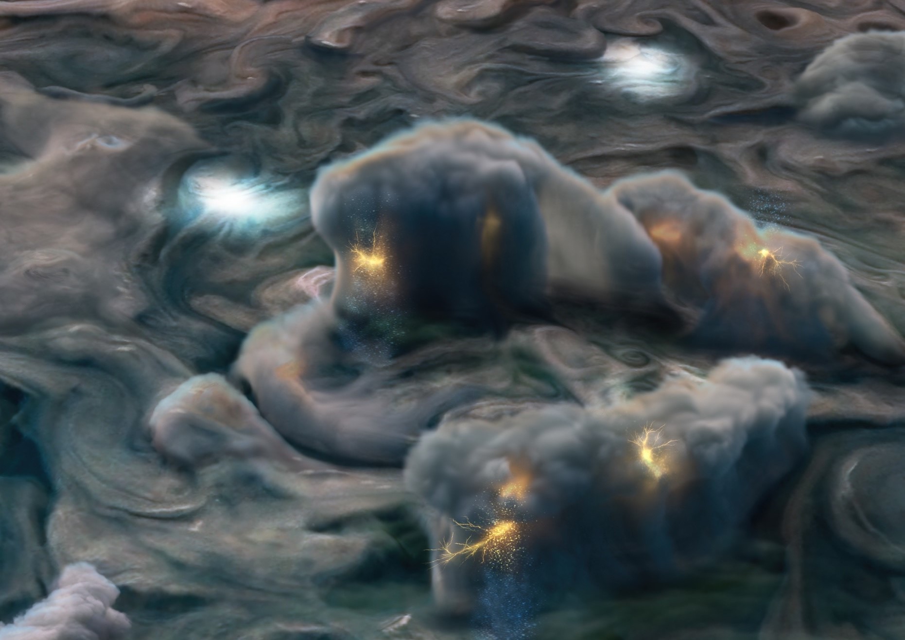 Jupiter is big. Really Big. (Apologies to Douglas Adams). It is the beautiful, bright planet that is visible all night now, rising in the east just after sunset, then travelling across the sky to set around sunrise. It will be with us through the end of the year. In our solar system, this is the big one. Jupiter has more mass than all the other planets, asteroids, comets and moons added together. In Roman mythology Jupiter is god of the sky and king of the gods. His wife, Juno, is the daughter of Saturn and mother of Mars. This is an illustrious family. Ten years ago, NASA launched a mission to Jupiter, naming it after Juno. It is a long way to Jupiter, so Juno only went into orbit in July 2016. And for the last 5 years Juno has been whipping around Jupiter, probing, taking beautiful pictures and overturning much of what we knew: Thunderstorms 50 km high! Ammonia and water “Mushballs”. Octagonal and pentagonal polar hurricane swarms. Coming next for Juno: the moons Io, Europa, Ganymede, in preparation for JUICE, the Jupiter Icy Moons Explorer, arriving at Jupiter 2029 to continue the search for life in the solar system.